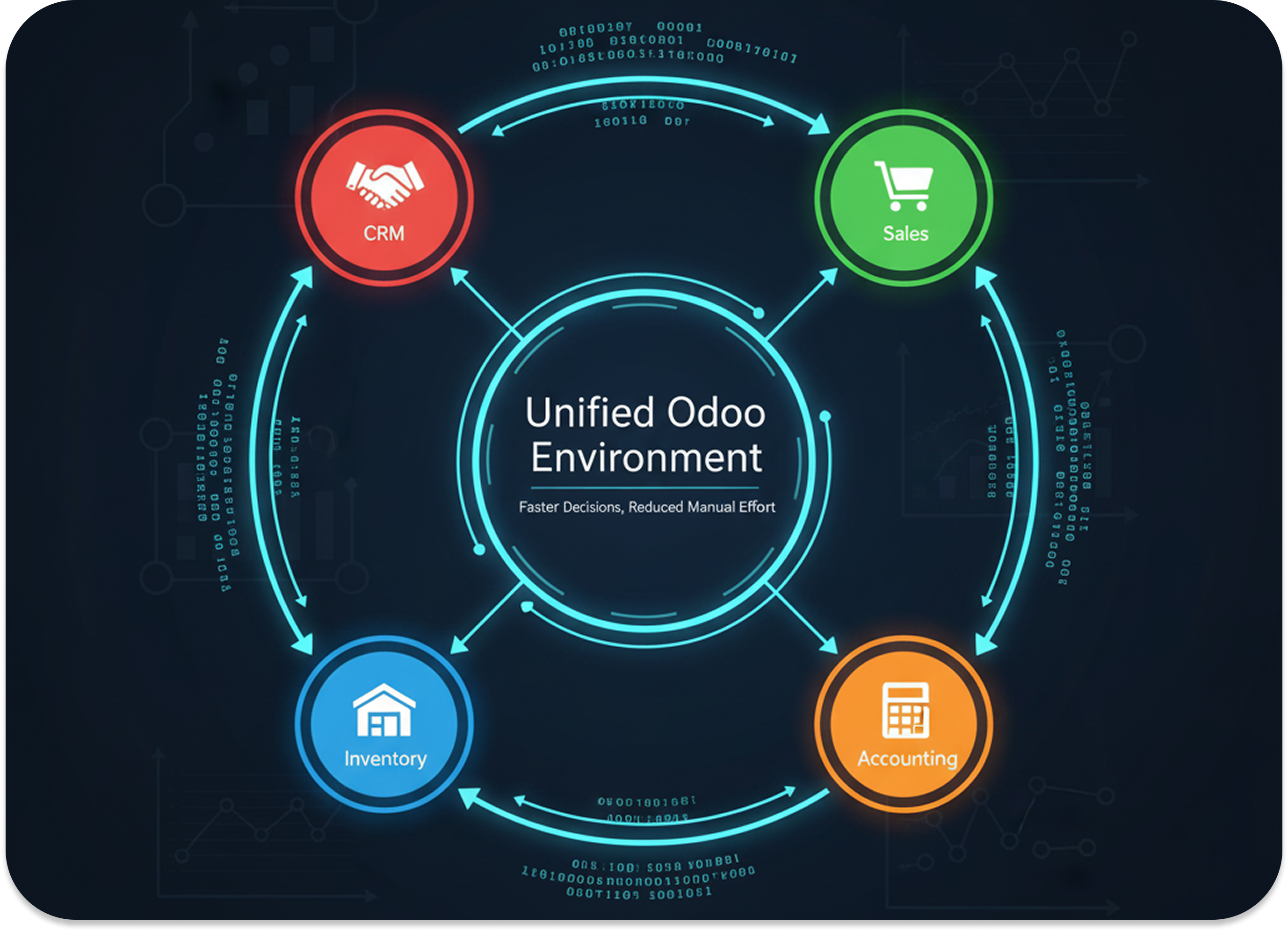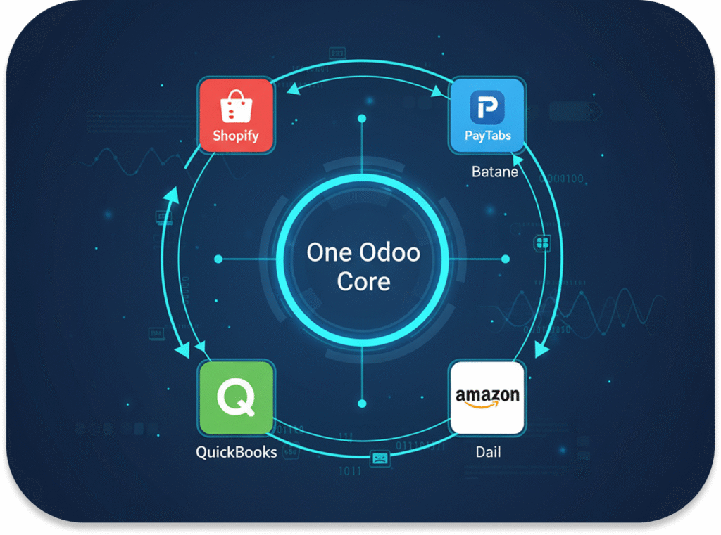 Inova Tech ensures your Odoo system connects effortlessly with all the tools your business depends on. Our integration expertise unites key Odoo apps such as CRM, Sales, and Accounting with third-party systems like Shopify, QuickBooks, Salesforce, WhatsApp, and payment gateways. The result is one synchronized environment where information flows securely and efficiently between all platforms.