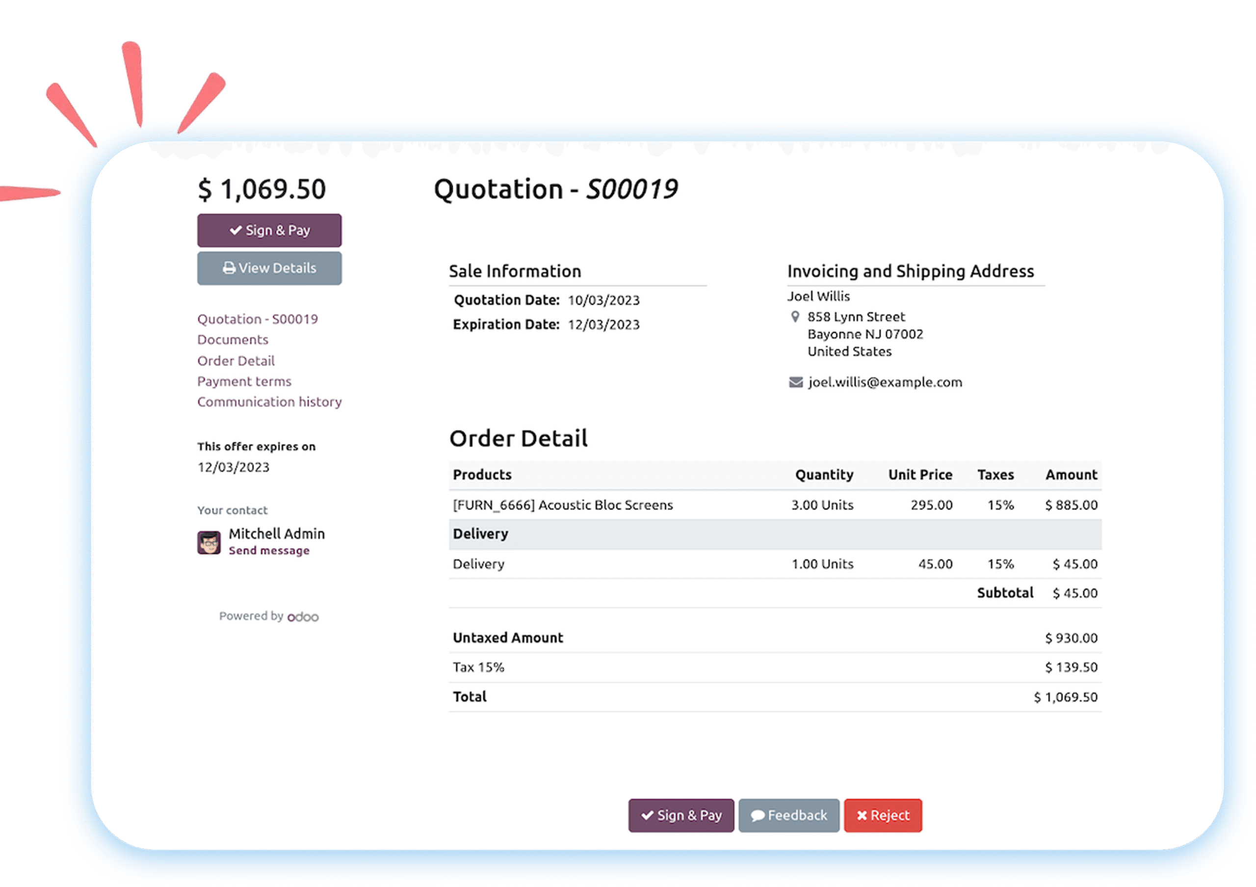 Apply ready-made templates, send interactive quotes, and close deals in minutes. Customers can review, sign, and pay online. No emails lost in limbo, no delays.